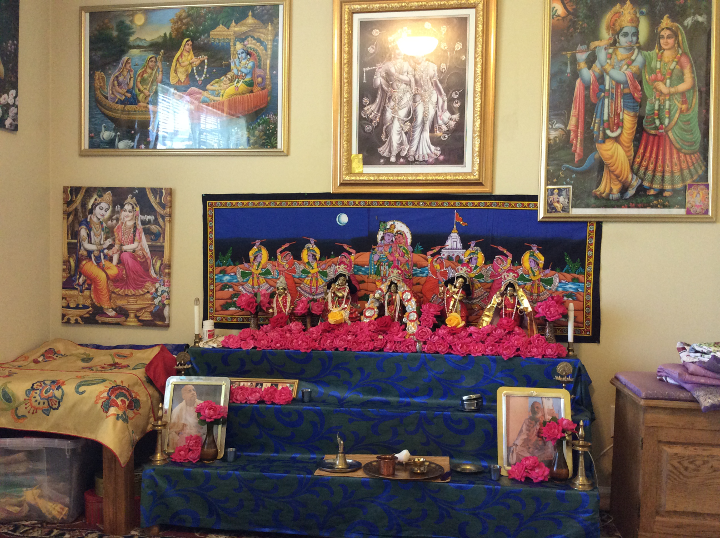 And most importantly, do not (repeat do not) keep any photos or things associated with your relatives who have passed away. It is a very serious aparadha. Also do not keep any other deities whatever they may be.Our goal is to serve Sri Sri Radha & Krishna with Ananya Bhakti. Like a chaste wife who has her complete love only to her husband, an anayna bhakta should have complete bhakti to Sri Radha Krishna alone. When we also worship demigods it is called misra-bhakti which we do not want. Even though all the other gods are servants or angas of Bhagavan Sri Krishna, do not keep any such deities in the temple. Many make their puja room like a mall of gods. However if you see other deities, you should give honor and respect but no dandavat pranams to them. Always remember that you belong one and only to Sri Sri Radha Krishna. By serving that Supreme lord, all the demigods are more satisfied than worshipping them separately. Demigods are the angas or branches and leaves of a tree. Only by pouring water to the root (Krishna) every part of the tree becomes healthy and happy.