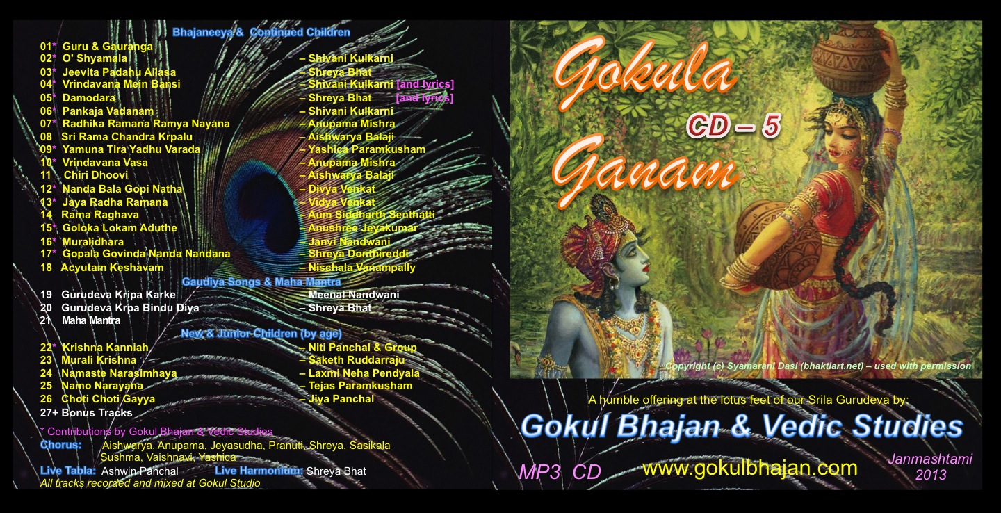 Gokula Ganam CD Track#Title of the SongSinger01 Guru Devam Vandam02 O Shyamala O Sundara - Shivani Shivani03 Jeevita Padahu Ailasa - Priya Priya04 Vrindavana Mein Bansi - Shivani Priya Shivani Priya05 Damodara Damodar - Priya Priya06 Pankaja Vadanam - Shivani Shivani07 Radhika Ramana - Anupama Anupama08 Sri Ramachandra Kripalu - Aishwarya Aishwarya09 Yamuna Tira - Yashica Yashica10 Vrindavana Vasa - Anupama Anupama11 Chiri Dhoovi - Aishwarya Aishwarya12 Nanda Bala - Divya Divya13 Jaya Radha Ramana - Vidya Vidya14 Rama Raghava-AumAum15 Goloka Lokam Aduthe - Anushree Anushree16 Muralidhara - Janvi Janvi17 Gopala Govinda - Shreya D Shreya D18 Acyutam Keshavam - Nischala Nischala19 Guru Deva Krpa Karke - Meenal Meenal20 Gurudeva Krpa Bindu Diya - Priya Priya21 Hare Krishna Maha Mantra22 Krsna Kanhiya - Niti Niti23 Murali Krishna - Saketh Saketh24 Namaste Narasimhaya - Neha Neha25 Namo Narayana - Tejas Tejas26 Choti Choti Gaiya - Jiya Jiya27 Jaya Radha Madhava - Archita Archita28 Bhaja Hu Re Mana - Aum Violin Aum Violin29 Jaya Radha Madhava - Aum Violin Aum Violin30 Namo Narayana - Smarana Srujana Smarana Srujana == (To download the audio, right click on audio control area below and save audio as...)