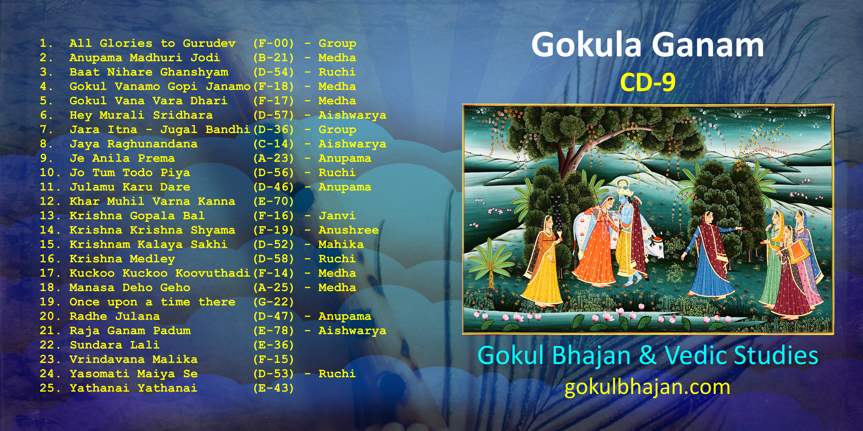Gokula Ganam CD Track#Title of the SongSinger01 Jaya Gurudeva Jaya Gurudeva02 Anupama Madhuri Jodi - Medha Medha03 Baat Nihare Ghanshyam - Ruchi Ruchi04 Gokul Vanamo Gopi Janamo - Medha Medha05 Gokul Vana Vara Dhari - Medha Medha06 Hey Murali Sridhara - Aishwarya Aishwarya07 Jara Itna Bata De Kanha - Bhajaneeya Bhajaneeya08 Jaya Raghunandana Jaya Sia Ram - Aishwarya Aishwarya09 Je Anila Prema Dhana - Anupama Anupama10 Jo Tum Todo Piya - Ruchi Ruchi11 Julam Kar Dare Ri Yah - Anupama Anupama12 Kaar Muhil Varna Kanna - BK Dasa BK Dasa13 Krishna Gopala Bal - Janvi Janvi14 Krishna Krishna Shyama - Anushree Anushree15 Krishnam Kalaya Sakhi Sundaram - Mahika Mahika16 Krishna Medley - Ruchi Ruchi17 Kuckoo Kuckoo Koovuthadi - Medha Medha18 Manasa Deho Geho - Medha Medha19 Once Upon A Time There was a man of Wise - BK Dasa BK Dasa20 Radhe Jhulana - Anupama Anupama21 Raja Ganam Padum Enthan - Aishwarya Aishwarya22 Sundara Lali - BK Dasa BK Dasa23 Vrindavana Malika Giridhari Ca - BK Dasa BK Dasa24 Yasomati Maiya Se - Ruchi Ruchi25 Yathanai Yathanai - BK Dasa BK Dasa == (To download the audio, right click on audio control area below and save audio as...)